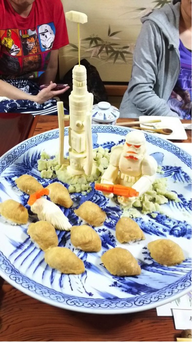 Ao longo de dez anos, o chef Okitsugu Kado, dono de um restaurante em Osaka, Japão, vem aperfeiçoando suas técnicas parar criar esculturas de Star Wars com ingredientes comuns da culinária japonesa. Cenouras, batata-doce e pepinos viram personagens da saga em suas mãos. Confira algumas imagens (fotos de @tomokiy, @booksbanana, e @tamassyBB8):