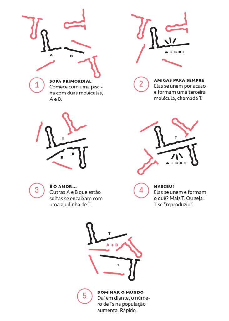 O resultado é uma habilidade peculiar: R3C começa a catalisar uma reação química cujo resultado é mais dele mesmo. Ele vira uma máquina de xerox que só faz mais R3C. Isso o torna um exemplo perfeito de molécula inanimada que faz uma malandragem de coisa viva: se reproduzir. Ele pode não ser a origem da vida na Terra, mas tem currículo para assumir o cargo.