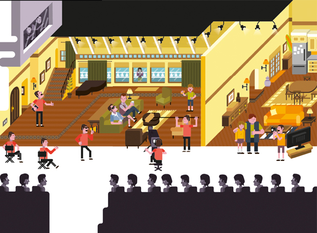 3. O set é como um grande teatro, com uma parte para o público e outra para o espaço cênico. Os cenários simulam ambientes fechados,como uma casa, mas sem uma das paredes (a chamada “quarta parede”). É por isso que eles são sempre registrados pelo mesmo ângulo -é o ponto de vista do telespectador, da plateia e das câmeras