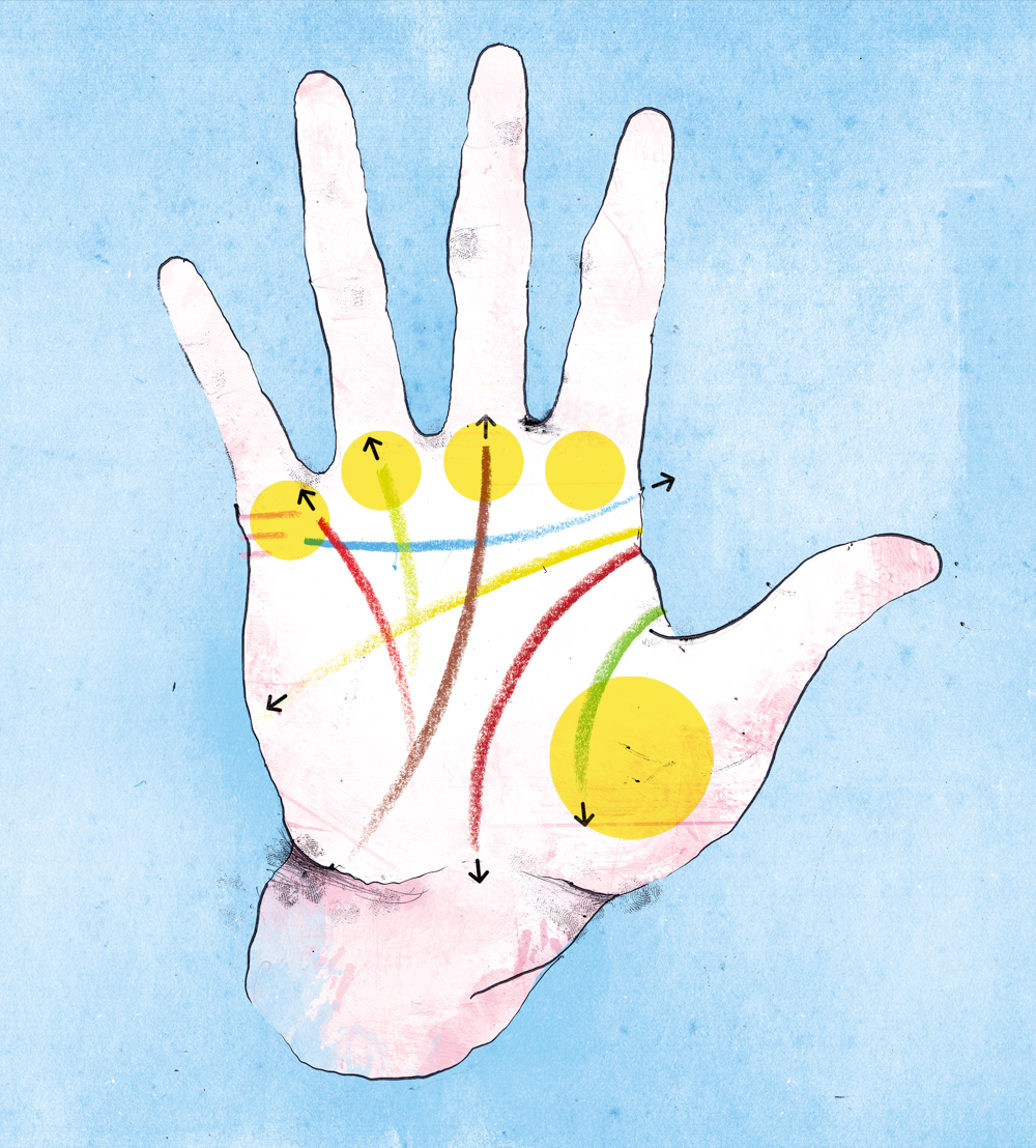 • Quem pensa em quiromancia (a arte de ler as mãos) imagina logo uma cigana. Mas a origem é bem mais remota: a prática começou há mais de 4 mil anos, segundo manuscritos encontrados no Egito, na Índia e na China. A técnica sobrevive até hoje por ser uma das mais fascinantes – e fáceis. Afinal, você só precisa da própria mão (aquela que usa para escrever) para tentar entender o que vai acontecer ao longo da sua vida. E a interpretação evolui com o tempo, conforme novas linhas surgem ou velhas se aprofundam. Descubra, a seguir, o significado dos principais vincos.
