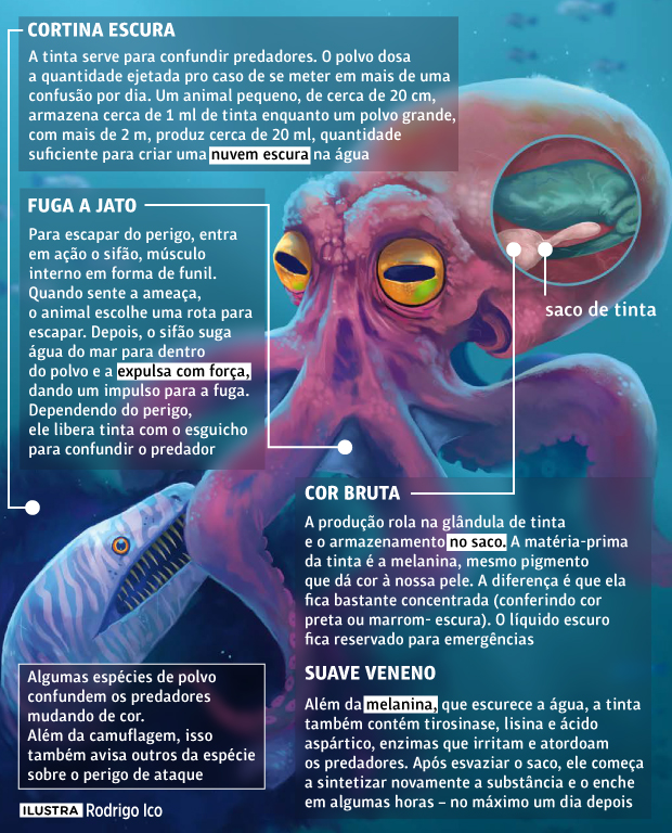 Além da melanina, que escurece a água, a tinta também contém tirosinase, lisina e ácido aspártico, enzimas que irritam e atordoam os predadores. Após esvaziar o saco, ele começa a sintetizar novamente a substância e o enche em algumas horas – no máximo um dia depois