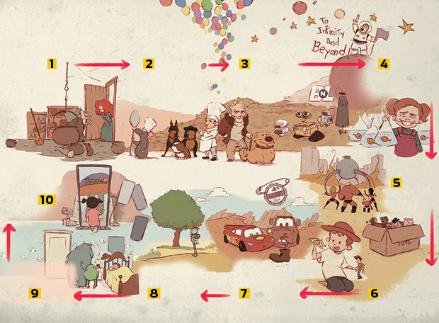 1. Tudo começa em Valente. A bruxa do filme (que some quando as portas se fecham atrás dela) possui uma mágica que faz os animais falarem. É essa mágica que, passada às próximas gerações, teria permitido a alguns animais do futuro falar e se tornar racionais. Isso explica como, em Ratatouille, o rato Remy consegue falar com os humanos e ter personalidade diferente da de seus colegas