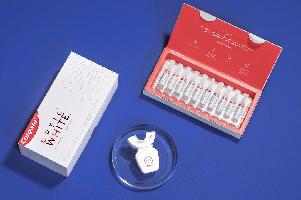 O kit de clareamento dental Optic White Advanced LED, da marca Colgate, vem com tubinhos de peróxido de hidrogênio e uma moldeira bucal dotada de LEDs.